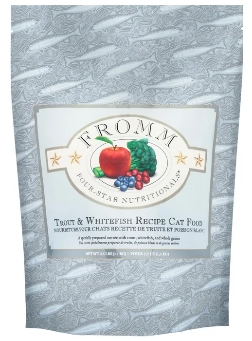 Fromm Four-Star Trout & Whitefish Recipe is a delicious entrée of trout, whitefish, and whole grains. This recipe is specially prepared to ensure consistency, quality, and superior taste in each and every bowl. Trout & Whitefish Recipe provides complete and balanced nutrition for cats of all ages and can be alternated with other Fromm Four-Star recipes.