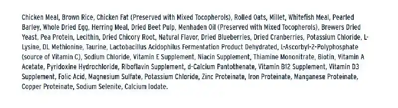 Chicken Meal, Brown Rice, Chicken Fat (Preserved with Mixed Tocopherols (Vitamin E)), Rolled Oats, Millet, Pearled Barley, Herring Meal, Whole Dried Egg, Dried Beet Pulp, Crab Meal, Menhaden Oil (Preserved with Mixed Tocopherols (Vitamin E)), Brewers Dried Yeast, Lecithin, Fat Product (Algae, Source of Fatty Acids), Cranberries, Salt, Calcium Carbonate, Potassium Chloride, L-Lysine, DL Methionine, Ascorbic Acid, Yucca Schidigera Extract, Taurine, Vitamin E Supplement, Niacin Supplement, Organic Dried Kelp, Biotin, Thiamine Mononitrate, Pyridoxine Hydrochloride, Vitamin A Acetate, Riboflavin Supplement, d-Calcium Pantothenate, Vitamin B12 Supplement, Citric Acid, Vitamin D3 Supplement, Folic Acid, Ferrous Sulfate, Zinc Sulfate, Zinc Proteinate, Iron Proteinate, Zinc Oxide, Copper Sulfate, Manganese Sulfate, Manganese Proteinate, Copper Proteinate, Manganous Oxide, Sodium Selenite, Calcium Iodate.