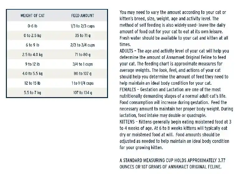 WEIGHT OF CAT (lbs./kg) FEED AMOUNTS (cups/grams) OF ANNAMAET ORIGINAL FELINE CHICKEN & FISH: