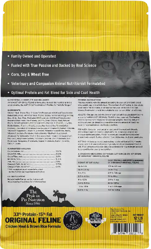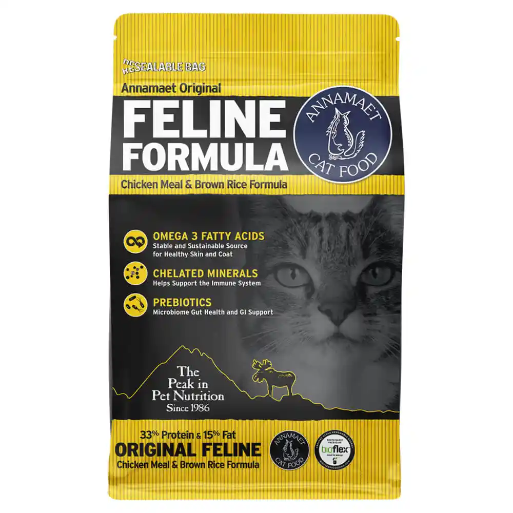 Designed for all stages of life, our formula has been developed to meet the standards of even the most finicky cats. With its added herring and crab meal, Annamaet Catfood is known for its exceptional palatability. It is formulated to meet the nutritional levels established by the AAFCO cat food nutrient profiles for "ALL LIFE STAGES" (Gestation, Lactation, Growth and Maintenance).