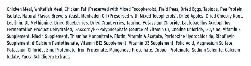 Chicken Meal, Tapioca, Chicken Fat (Preserved with Mixed Tocopherols (Vitamin E)), Herring Meal, Dried Eggs, Brewers Yeast, Field Peas, Menhaden Oil (Preserved with Mixed Tocopherols (Vitamin E)), Natural Flavor, Carrots, Celery, Parsley, Lettuce, Watercress, Spinach, Lecithin, Fat Product (Algae, Source of Fatty Acids), Cranberries, Potassium Chloride, DL Methionine, Ascorbic Acid, Yucca Schidigera Extract, Taurine, Choline Chloride, Vitamin E Supplement, Niacin Supplement, Organic Dried Kelp, Biotin, Thiamine Mononitrate, Pyridoxine Hydrochloride, Vitamin A Acetate, Riboflavin Supplement, d-Calcium Pantothenate, Vitamin B12 Supplement, Citric Acid, Vitamin D3 Supplement, Folic Acid, Ferrous Sulfate, Zinc Sulfate, Zinc Proteinate, Iron Proteinate, Zinc Oxide, Copper Sulfate, Manganese Sulfate, Manganese Proteinate, Copper Proteinate, Manganous Oxide, Sodium Selenite, Calcium Iodate.