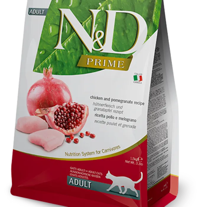 NUTRITION FOR CARNIVORES. N&D Prime Chicken & Pomegranate Feline is a complete and balanced diet for all life stages with 98% of the protein from animal source formulated to meet the nutritional levels for maintenance. Made with Non-GMO and human-grade fresh (never frozen) ingredients like free-range chicken, free-range eggs, sustainably sourced wild-caught herring, sweet potatoes and pomegranate. Low glycemic index, high-protein, grain-free and gluten-free recipe with no legumes, meals, by-products, hormones, antibiotics, or artificial preservatives. Made with natural antioxidants, prebiotics and integrated additional taurine. All formulations are scientifically-proven and clinically-tested thru certified cruelty-free research. Guaranteed over 90% digestibility. THE ONLY KIBBLE FILLED WITH COLD INJECTED LIFE ESSENTIALS (dehydrated fruits and vegetables, botanicals, vitamins, and minerals are vacuum-infused cold-pressed into the kibble after cooking). Nitrogen filled bags to prevent the food from oxidation. All packaging is recyclable and BPA-Free.