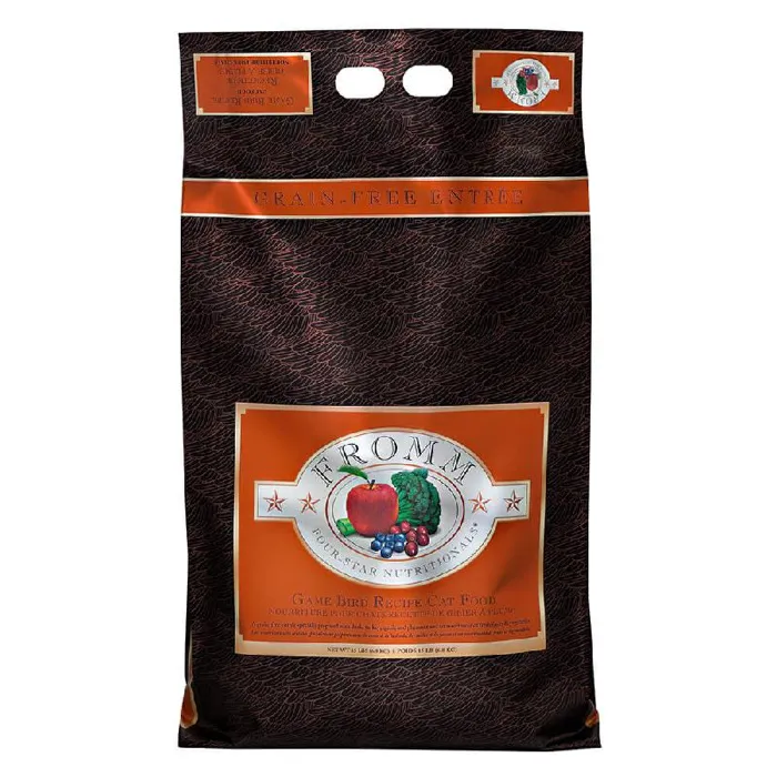 Fromm Four-Star Game Bird Recipe is a distinctive, grain-free blend of turkey, turkey broth, goose, and accents of duck, pheasant, and quail. This recipe is specially prepared to ensure consistency, quality, and superior taste in each and every bowl. Game Bird Recipe provides complete and balanced nutrition for cats of all ages and, for variety, can be alternated with other Fromm Four-Star recipes.