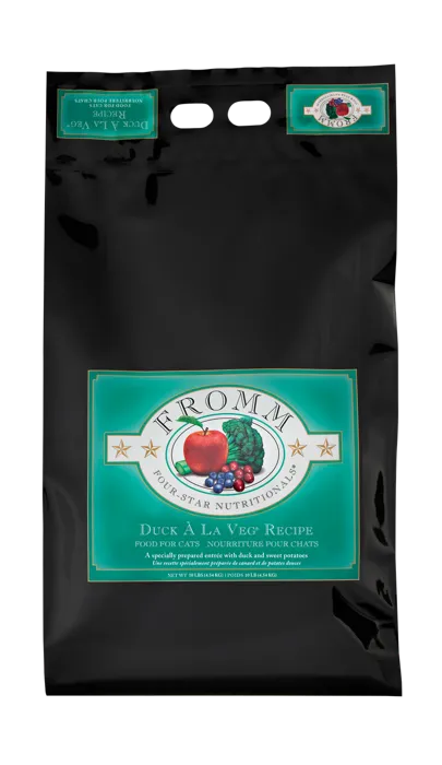 Fromm Four-Star Duck À La Veg® Recipe is an inviting entrée of duck and sweet potatoes. This recipe is specially prepared to ensure consistency, quality, and superior taste in each and every bowl. Duck À La Veg® Recipe provides complete and balanced nutrition for cats of all ages and can be alternated with other Fromm Four-Star recipes.