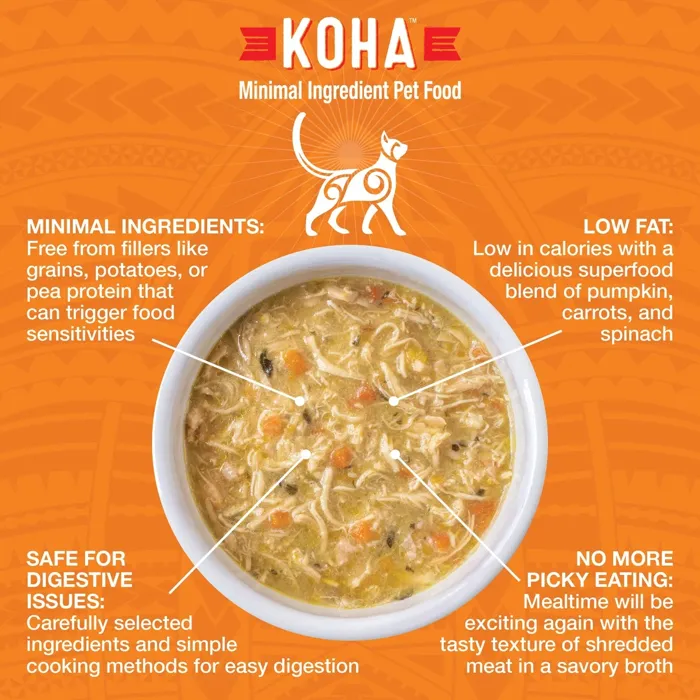 KOHA Pure Shreds are delicious shredded chicken breast recipes in a savory broth. Cats go crazy for the shredded texture and the tasty superfood blend of pumpkin, carrots, & spinach. This low fat entrée is an excellent choice for weight control. Our Pure Shreds Shredded Chicken Breast Entrée does not contain any unnecessary fillers or artificial preservatives or carb-loaded fillers like peas, potatoes, and grains that can lead to digestive issues.
