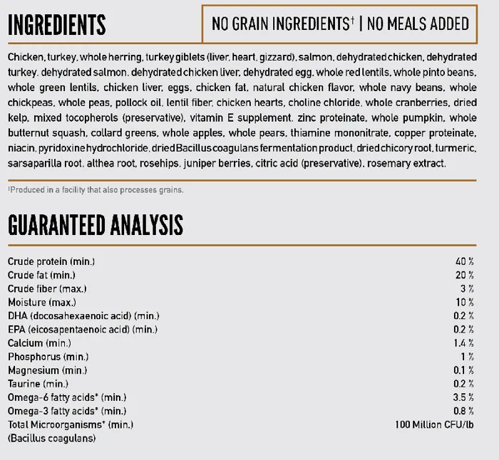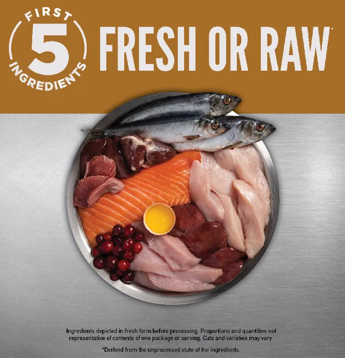 - Offers a diversity of fresh and raw meats unmatched by conventional cat food; 85% meat inclusions, 15% veggies & fruits, 0% grain