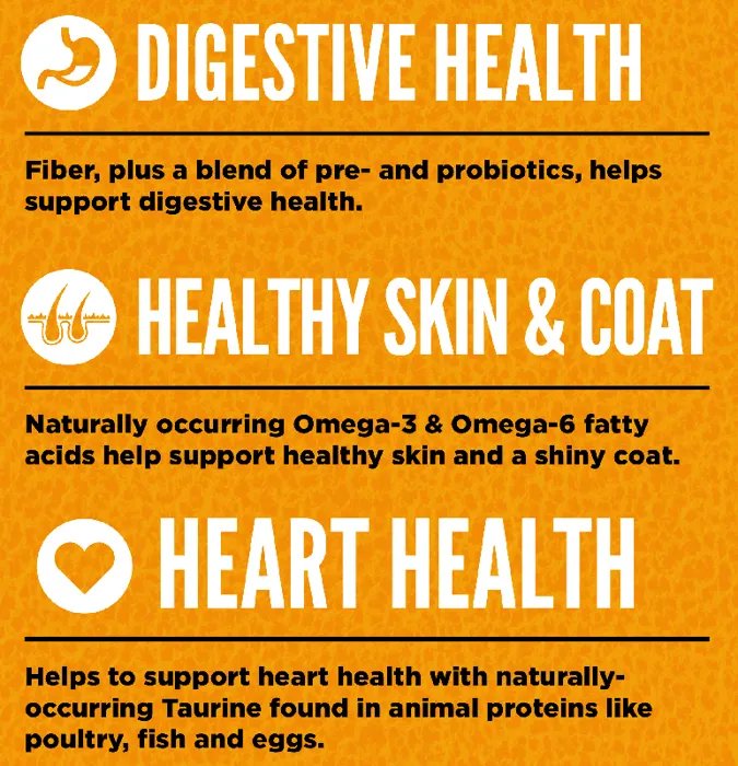 - Premium cat and kitten food made with free-run chicken and turkey, wild-caught fish, and cage-free eggs