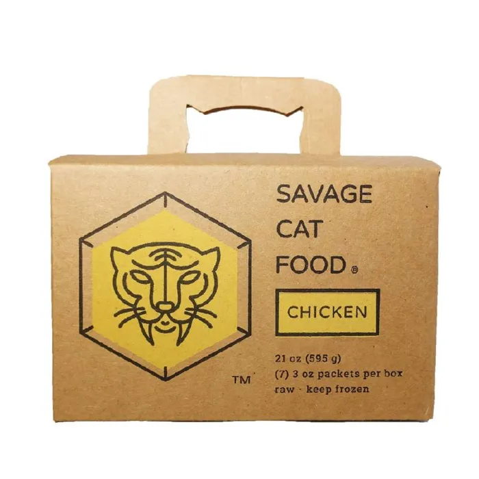 Organic whole chicken with bones, organic chicken hearts, organic chicken liver, egg yolks, water, organic psyllium seed husk, wild salmon oil, taurine, vitamin E supplement, bovine adrenal tissue, bovine spleen tissue, ovine thymus tissue, porcine pancreas tissue, salt, thiamine mononitrate, riboflavin supplement, niacin, pantothenic acid, pyridoxine hydrochloride, folic acid, vitamin B12 supplement.All chicken is born, raised and harvested in California and is certified organic, free range, certified humane and antibiotic freeProtein: 13% min.Fat: 6% min.Fiber: .5% max.Moisture: 78% max.Ash: 2.5% max.Calcium: .8%Phosphorus: .7%Magnesium: .05%Taurine: .2%36 kcal ME/ozCalcium to phosphorus ratio: 1.2:1Feeding directions: Store frozen and thaw 1-2 servings in the refrigerator prior to feeding. Feed cat 2% to 4% of cat’s weight daily. The recommended daily total for a 10 lb. adult cat is 3 to 6 ounces of Savage Cat Food. Discard any food that is not consumed within an hour and clean serving dish and surfaces. Feed one to two meals daily or as advised by your veterinarian. Kittens can eat 4% to 10% of their body weight depending on age and activity level. Pregnant and nursing females can eat 2 to 3 times the normal adult amount which can vary based on their litter size.TIP: Packets can be taken directly from the freezer and run under lukewarm water to thaw. Or, take the packet from the freezer, remove the meat from the pouch and thaw in a serving dish overnight.