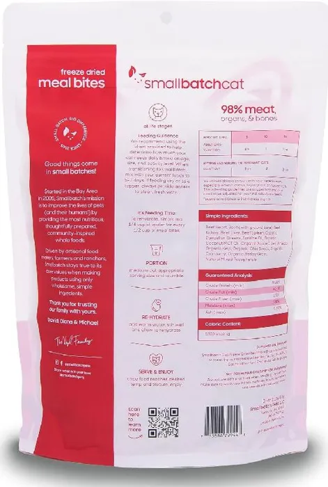 Single-source protein, complete freeze-dried diets for cats featuring 98% meat, organ and bone recipes. Unlike other brands, smallbatch uses exclusively humanely raised, whole cuts of meat and naturally derived nutrients from whole foods. Portioned in convenient bite sized pieces, meal bites are easy to rehydrate and serve, or use as a crunchy topper. Confidently feed your carnivore a minimally processed, nature inspired diet.