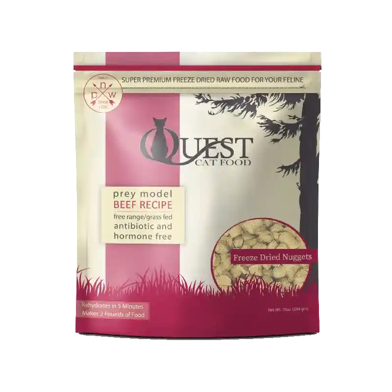 Steve’s Quest Freeze-Dried Raw Cat Food Beef Recipe is crafted with grass-fed, grass-finished beef from free-range cows. This Prey model beef cat food recipe features 95% meat, bone, and organ, complemented by 5% superfoods like New Zealand Green Lipped Mussel and raw goat milk, offering unmatched nutrition. Freeze-dried for convenience, this raw diet meets and exceeds AAFCO nutritional standards for all life stages. Quest Beef is a fan-favorite and provides everything your cat needs to thrive.