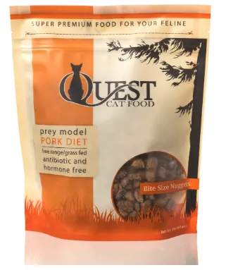 Quest Cat Food is a prey model diet consisting of 95% muscle meat, ground bone, and organ. We add a few super-foods to round off the diet and make it the purrrfect food for your feline. We form the food into smaller bite-size nuggets that make it easier for cats to dive into a bowl of fresh food. Our Pork Diet is our highest fat cat food formula, making it ideal for thin felines.