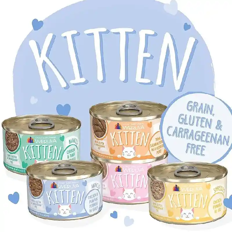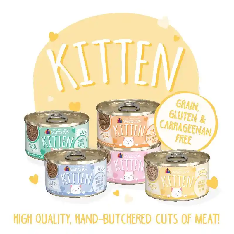 Weruva Kitten recipes are formulated with high-quality proteins and high moisture content to support your kitten's nutritional needs. These complete, balanced meals are grain, gluten, and carrageenan free.