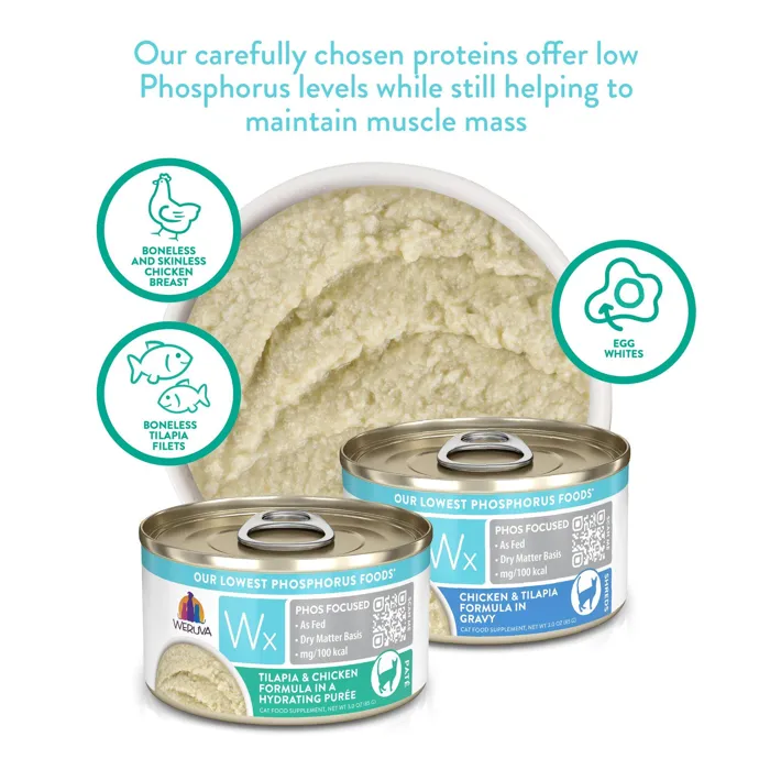 Low in phosphorus and high in flavor, your cat will love these new meals from Weruva! Weruva's new WX Phos Focused Foods are a special line of tasty recipes that are low in phosphorus for your cat's health and happiness. Features animal-based proteins with naturally low phosphorus levels. High in moisture for hydration. Ideal for cats with special dietary needs. Grain & Gluten-Free. No Artificial Additives. Thoughtfully selected by the Pet Beastro for your cat's health and wellness!