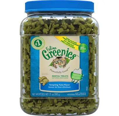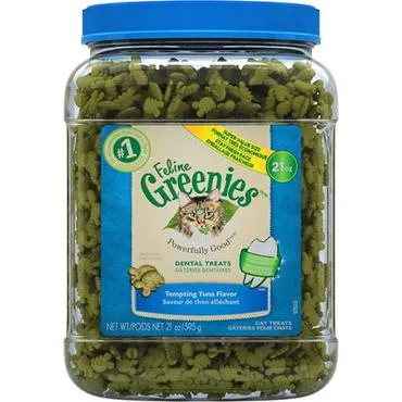 FELINE GREENIES Tempting Tuna Flavor Dental Cat Treats were designed to help keep your cat’s teeth clean and healthy. The crunchy texture of these irresistible cat snacks helps clean teeth, reduce tartar buildup, and freshen cat breath, letting you enjoy cuddle time even more. Made with natural ingredients plus vitamins, minerals, and other nutrients, these tasty treats are also nutritionally complete and balanced for adult cats. Plus, FELINE GREENIES Dental Treats contain less than 2 calories per treat and are the #1 vet-recommended feline dental treat.* Give your cat FELINE GREENIES Dental Treats and you're sure to hear happy purrs of joy. FELINE GREENIES Daily Dental Treats... for healthy and happy dental care.