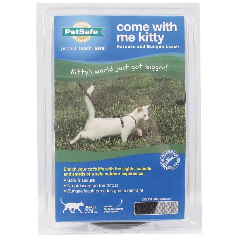 The Come With Me Kitty™ Harness and Bungee Leash can help you enrich your cat’s life with the sights, sounds, and smells of a safe outdoor experience. It gives you gentle, comfortable control of your cat or kitten. Now you can share enjoyable walks, exercise, and playtime outside your home. The bungee leash was specially designed to gently and securely control your cat. When your cat moves forward, the leash flexes with your cat’s movement and tightens across the harness shoulder straps. This removes pressure from the delicate throat area, preventing your cat from choking or escaping.