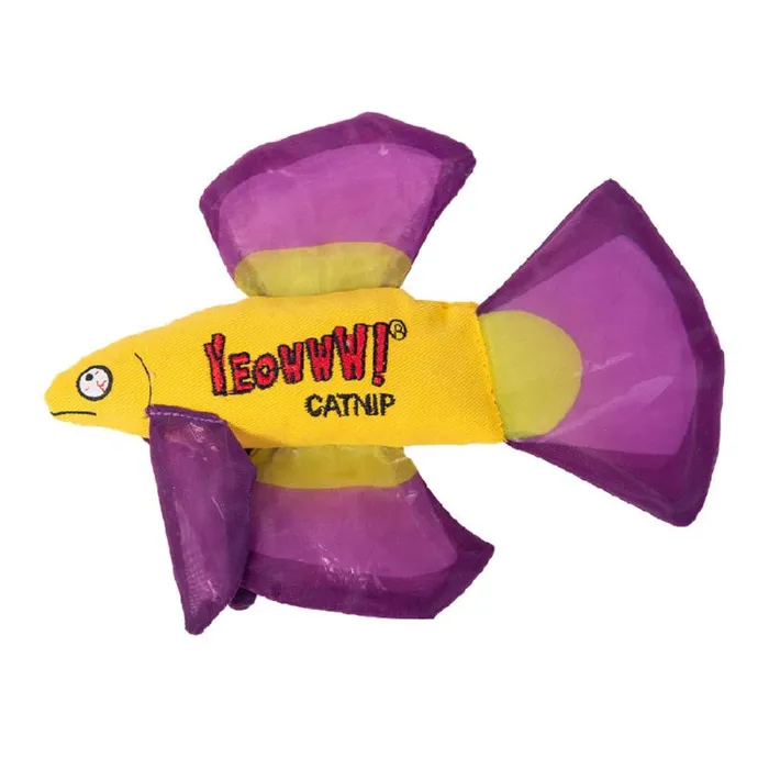 Calling all fans of fancy-finned, carefree freshwater fighting fish. Your cat’s playtime will scale new heights with these fun fish freshly stuffed with organically grown catnip. Made of a durable cotton twill body right here in the USA. Crinkle fabric adds a fun little crunch to the experience. From tip to tail, each betta fish is 6.5” long and comes in one of three colors: blue, purple or red. Relax, no tank needed!