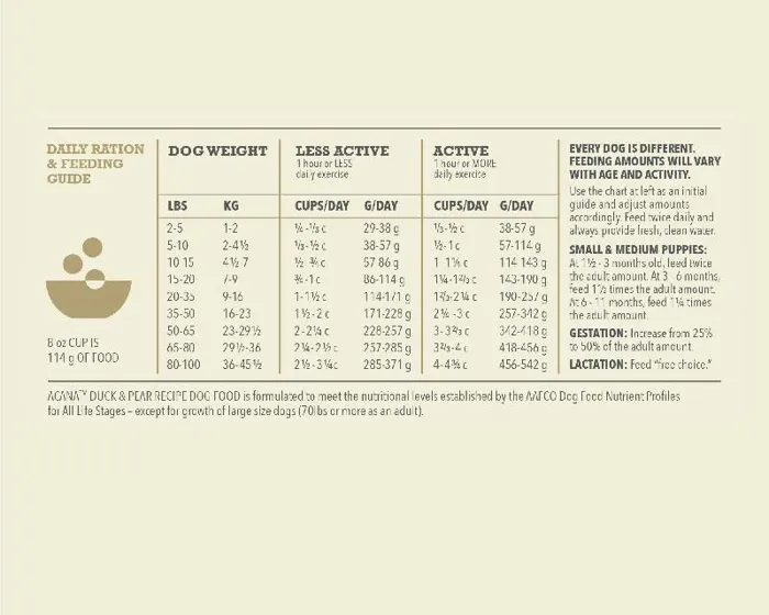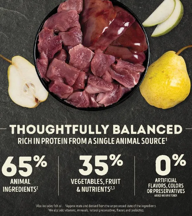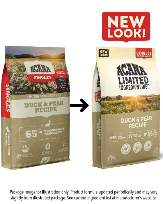 Our ACANA® foods always goes beyond the 1st ingredient, thoughtfully crafting our recipes from start to finish. Our ACANA Singles Limited Ingredient Diet Duck & Pear Recipe is now loaded with more duck, fewer legumes and no peas for enhanced nutrition and taste your dog will love! Our enhanced recipe** includes 65%* quality ingredients from a single animal source and is complemented with whole, delicious pears. Complete nutrition for choosy dogs or healthy dogs with food sensitivities. Our premium ingredients come from a curated group of farmers, ranchers and fishers we’ve known and trusted for decades, and we approach every batch with an unsurpassed commitment to safety and quality in our award-winning Kentucky kitchen. The result is a protein-rich, nutritious, and delicious dog food to help them stay happy, healthy, and thriving. *approximate and derived from the unprocessed state of the ingredients. *Compared to our previous Duck & Pear formula