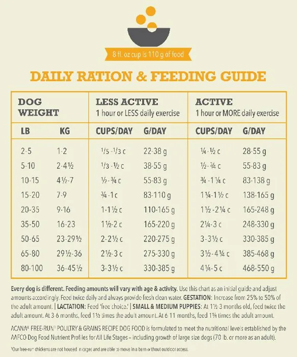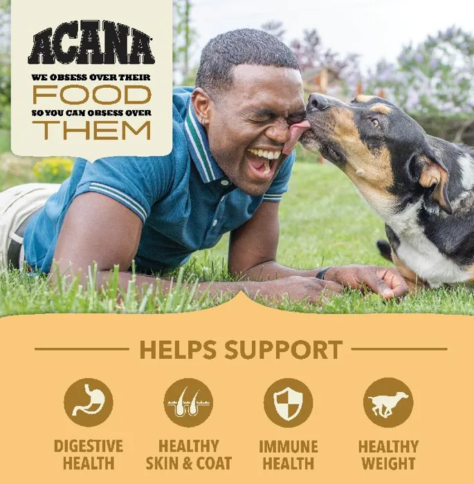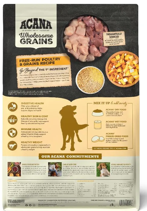 Our ACANA® food for dogs always goes beyond the 1st ingredient, thoughtfully crafted from start to finish. ACANA Wholesome Grains Free-Run Poultry & Grains Recipe is packed with our delicious free-run chicken and turkey*, cage-free eggs, and complemented with wholesome grains like oats, sorghum, and millet. These grains are high in fiber and gluten-free, offering added nutrition that helps support a healthy digestive environment. Our premium ingredients come from a curated group of farmers, ranchers and fishers we’ve known and trusted for decades, and we approach every batch with an unsurpassed commitment to safety and quality in our award-winning Kentucky kitchen. The result is a protein-rich, nutritious, and delicious dog food to help them live a healthy, happy life. *Our free-run chickens/turkeys move freely in a barn, never outdoors for their protection, and are not housed in cages