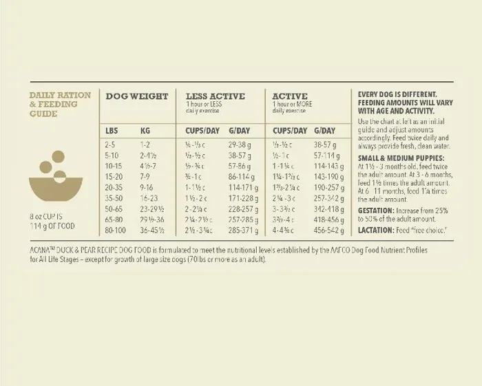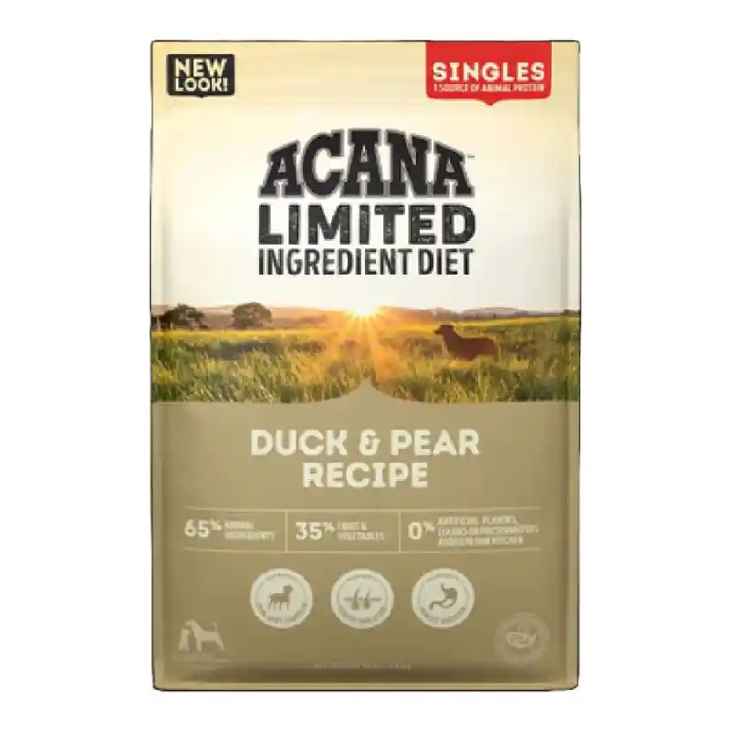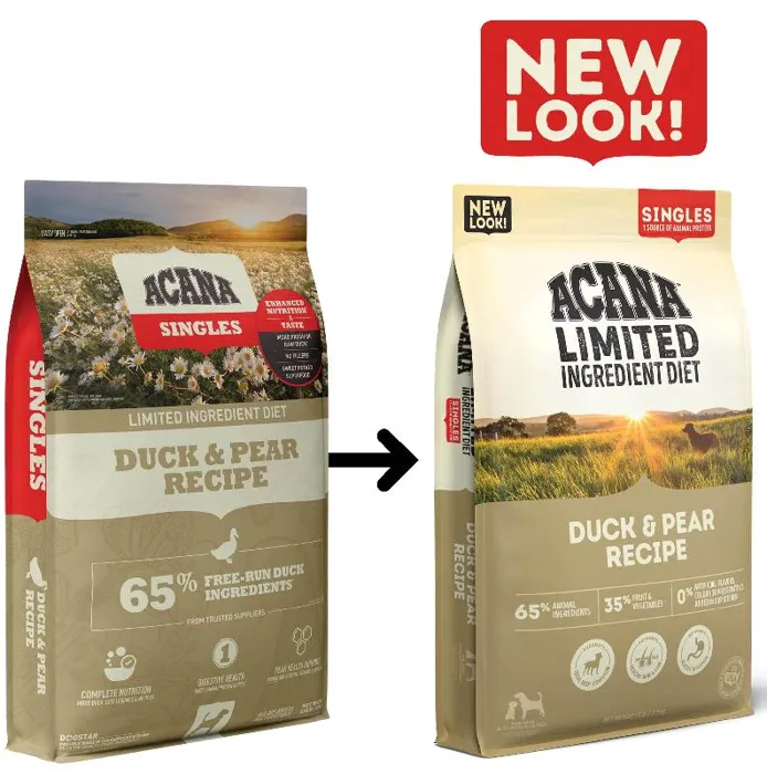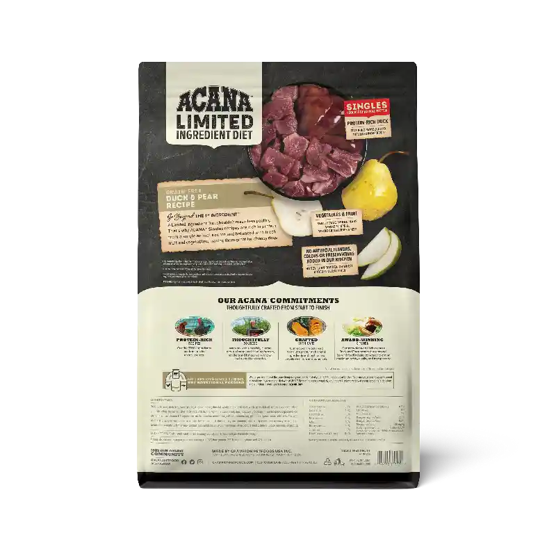 Our ACANA® foods always goes beyond the 1st ingredient, thoughtfully crafting our recipes from start to finish. Our ACANA Singles Limited Ingredient Diet Duck & Pear Recipe is now loaded with more duck, fewer legumes and no peas for enhanced nutrition and taste your dog will love! Our enhanced recipe** includes 65%* quality ingredients from a single animal source and is complemented with whole, delicious pears. Complete nutrition for choosy dogs or healthy dogs with food sensitivities. Our premium ingredients come from a curated group of farmers, ranchers and fishers we’ve known and trusted for decades, and we approach every batch with an unsurpassed commitment to safety and quality in our award-winning Kentucky kitchen. The result is a protein-rich, nutritious, and delicious dog food to help them stay happy, healthy, and thriving. *approximate and derived from the unprocessed state of the ingredients. *Compared to our previous Duck & Pear formula
