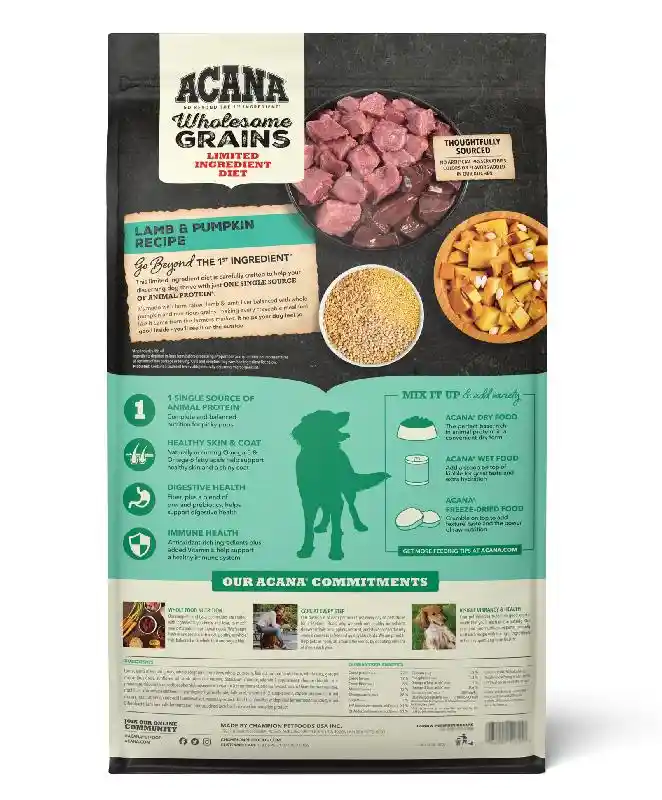 Our ACANA® food for dogs always goes beyond the 1st ingredient, thoughtfully crafted from start to finish. ACANA Wholesome Grains Limited Ingredient Diet Lamb & Pumpkin Recipe is packed with 60%* quality lamb ingredients, and complemented with whole, delicious pumpkin and fiber-rich wholesome grains. It provides complete nutrition for choosy dogs or healthy dogs with food-sensitivities. Our premium ingredients come from a curated group of farmers, ranchers and fishers we’ve known and trusted for decades, and we approach every batch with an unsurpassed commitment to safety and quality in our award-winning Kentucky kitchen. The result is a protein-rich, nutritious, and delicious dog food to help them stay happy and healthy. *approximate and derived from the unprocessed state of the ingredients.