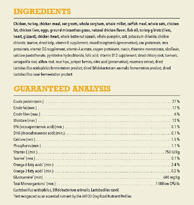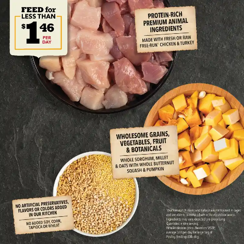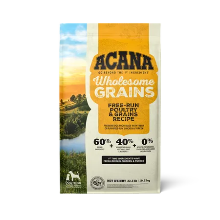 Our ACANA® food for dogs always goes beyond the 1st ingredient, thoughtfully crafted from start to finish. ACANA Wholesome Grains Free-Run Poultry & Grains Recipe is packed with our delicious free-run chicken and turkey*, cage-free eggs, and complemented with wholesome grains like oats, sorghum, and millet. These grains are high in fiber and gluten-free, offering added nutrition that helps support a healthy digestive environment. Our premium ingredients come from a curated group of farmers, ranchers and fishers we’ve known and trusted for decades, and we approach every batch with an unsurpassed commitment to safety and quality in our award-winning Kentucky kitchen. The result is a protein-rich, nutritious, and delicious dog food to help them live a healthy, happy life. *Our free-run chickens/turkeys move freely in a barn, never outdoors for their protection, and are not housed in cages
