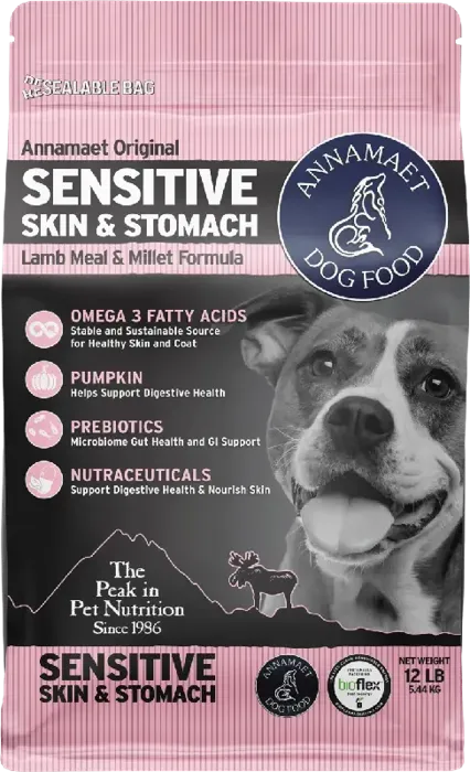 Annamaet Sensitive Skin and Stomach dog food is formulated to meet all the nutritional levels established by the AAFCO Dog Food Nutrient Profiles for gestation, lactation and maintenance.