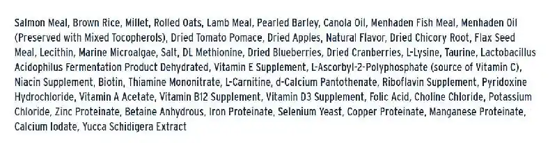 Salmon Meal, Brown Rice, Millet, Venison Meal, Rolled Oats, Pearled Barley, Canola Oil, Lamb Meal, Menhaden Fish Meal, Menhaden Oil (Preserved with Mixed Tocopherols (Vitamin E)), Dried Tomato Pomace, Flax Seed Meal, Lecithin, Fat Product (Algae, Source of Fatty Acids), Carrot, Celery, Parsley, Lettuce, Watercress, Spinach, Salt, DL Methionine, L-Lysine, Cranberries, Lactobacillus Acidophilus Fermentation Product Dehydrated, Oligofructose, Yucca Schidigera Extract, Vitamin E Supplement, LAscorbyl- 2-Polyphosphate (source of Vitamin C), Niacin Supplement, Biotin, Thiamine Mononitrate, L-Carnitine, d-Calcium Pantothenate, Riboflavin Supplement, Pyridoxine Hydrochloride, Vitamin A Acetate, Vitamin B12 Supplement, Vitamin D3 Supplement, Folic Acid, Choline Chloride, Potassium Chloride, Zinc Proteinate, Betaine Anhydrous, Iron Proteinate, Selenium Yeast, Copper Proteinate, Manganese Proteinate, Calcium Iodate.