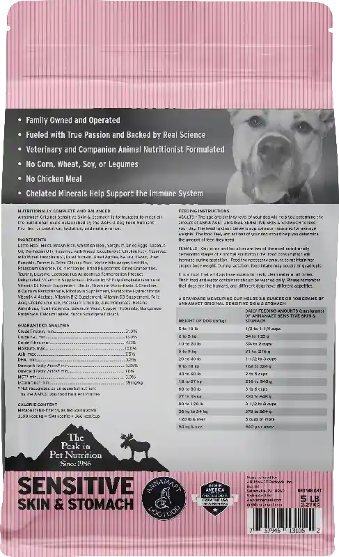 Annamaet Sensitive Skin and Stomach dog food is formulated to meet all the nutritional levels established by the AAFCO Dog Food Nutrient Profiles for gestation, lactation and maintenance.