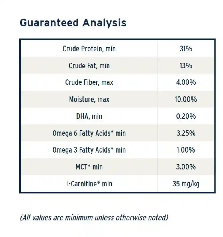 - Fortified with DHA – a major Omega 3 Fatty Acid that supports healthy skin and coat.