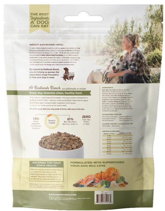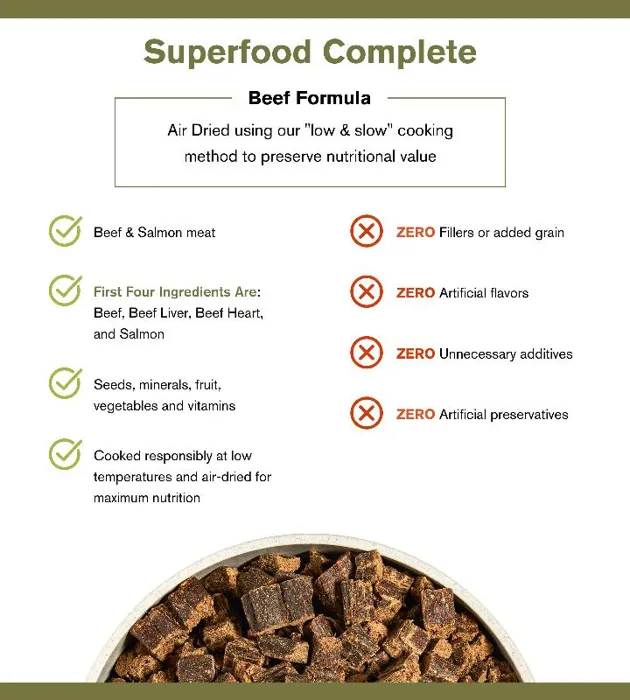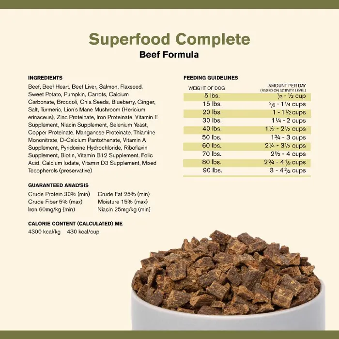 These carefully selected ingredients are cooked responsibly at low temperatures to deliver maximum nutrition with every bite. Superfood Complete contains no corn, soy, wheat, or fillers — it’s all the good stuff your dog needs to thrive, with none of the bad.