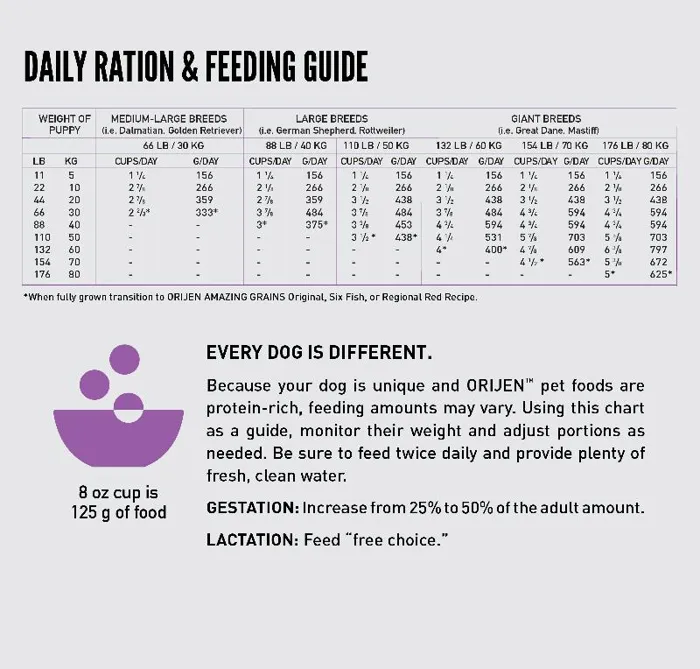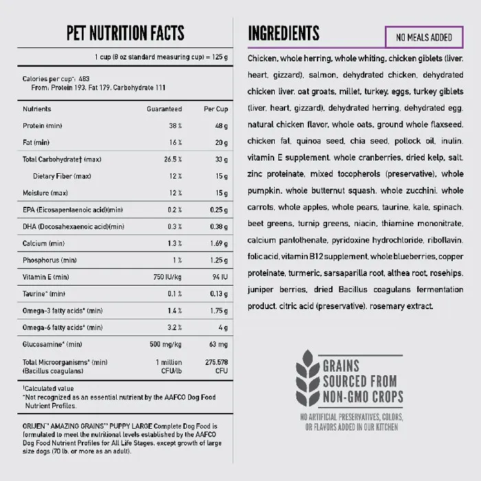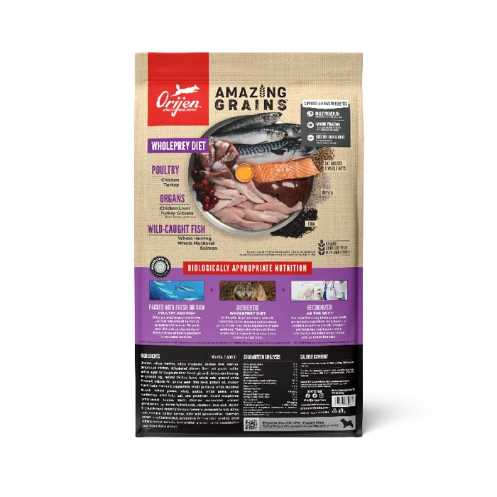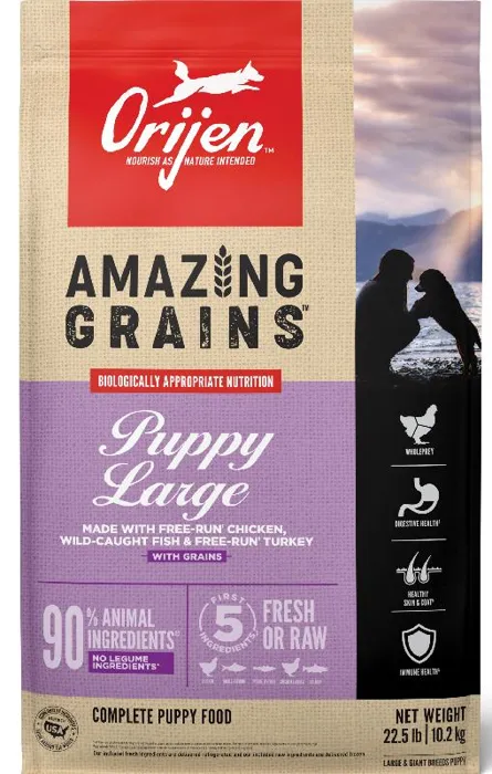 ORIJEN Amazing Grains is packed with fresh or raw animal protein and enhanced with hand-selected grains to give your dog peak nourishment. With 90%* premium animal ingredients, ORIJEN Puppy Large diet with Amazing Grains includes WholePrey ingredients from free-run chicken and turkey and wild-caught fish, including wild-caught salmon. These nutrient-dense poultry and fish ingredients nourish your large breed puppy’s rapid growth and development. This diet includes only the most amazing grains in a high-quality blend of oats, quinoa and chia and more, hand-selected to provide a balanced fiber ratio that helps support your large breed puppy’s digestive health.