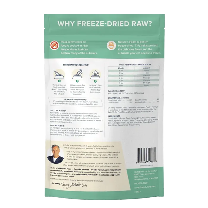 America’s Foremost Integrative VeterinarianFor more than four decades, Dr. Marty has helped countless cats thrive with his whole-food approach to feline nutrition. Early in his career, he discovered commercial cat foods were full of perservatives, grains, and low-quality ingredients. The problem is, cats are obligate carnivores-- meaning they need a diet rich in meat to thrive.He switched his feline clients to a diet full of real cuts of meat. whole food. After a few weeks, their overall well- being had noticeably improved.That's why Nature's Feast-- Essential Wellness-- Poultry combines premium cuts of meat for protein and nutrients to support healthy teeth and skin, easy digestion, balanced energy, and vital organs-- and antioxidants + prebotics from real veggies, fruit, and seeds to support lasting health