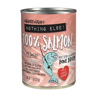 Give your pooch a revolutionary boost of nutrition with the Against the Grain Nothing Else Salmon Canned Grain-Free Dog Food. Formulated with salmon from local farms as the only ingredient in a delicious loaf dripping in tasty gravy, it provides pure protein for your pal with zero extra ingredients or anything synthetic. That means no complicated labels to decipher when it comes to feeding your dog the grain-free diet he evolved to thrive on, and is also ideal for pups with food sensitivities or on limited ingredient diets. It’s vacuum packed and cooked with no added water right in the can to seal in all the nutrition and flavor. Plus, it’s proudly made in the USA and comes in a BPA-free can.