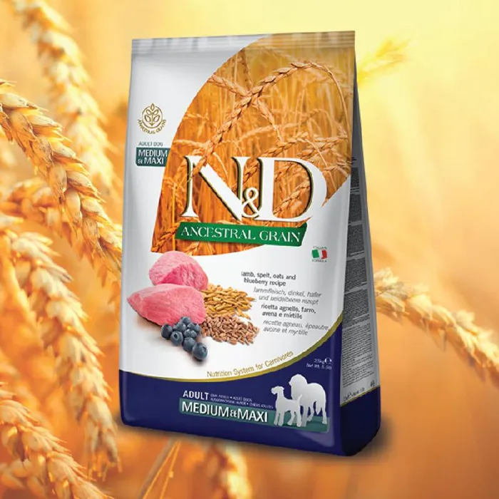 HEALTHY ACIENT GRAINS NUTRITION. N&D Ancestral Grain Lamb & Blueberry Canine Medium/Large Breed is a complete and balanced diet for all life stages with 90% of the protein from animal source formulated to meet the nutritional levels for maintenance. Made with Non-GMO and human-grade fresh (never frozen) ingredients like free-range grass-fed lamb, free-range eggs, sustainably sourced wild-caught herring, organic spelt, organic oats and blueberry. Low glycemic index recipe with no corn, wheat, legumes, potato, soy, meals, by-products, hormones, antibiotics, or artificial preservatives. Made with natural antioxidants, prebiotics, glucosamine and chondroitin. All formulations are scientifically-proven and clinically-tested thru certified cruelty-free research. Guaranteed over 90% digestibility. THE ONLY KIBBLE FILLED WITH COLD INJECTED LIFE ESSENTIALS (dehydrated fruits and vegetables, botanicals, vitamins, and minerals are vacuum-infused cold-pressed into the kibble after cooking). Nitrogen filled bags to prevent the food from oxidation. All packaging is recyclable and BPA-Free.