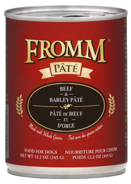Perfect as a complete meal or accompanying your dog's favorite dry food, Fromm Gold Beef and Barley Pate Canned Dog Food provides balanced and complete nutrition for all breeds and all stages of life. This recipe is made with high quality, finely minced beef cooked in broth. Fromm Gold Beef and Barley Pate Canned Dog Food is made with no artificial colors, flavors, or preservatives.