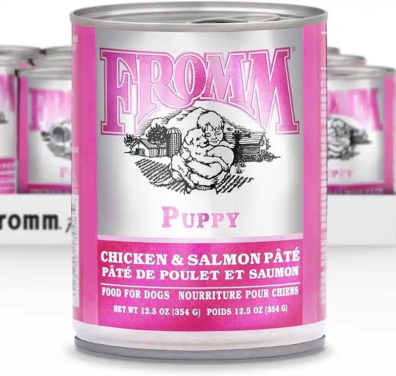 063 kcal/kg377 kcal/can\nFromm® Puppy Chicken & Salmon Pâté Food for Dogs is formulated to meet the nutritional levels established by the AAFCO Dog Food Nutrient Profiles for gestation/lactation and growth,