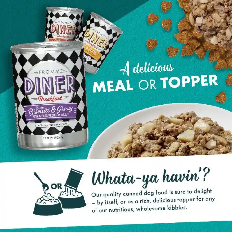 "Choline Chloride.\\\\\\\\\\\\\\\\\\\\\\\\\\\\\\\\nGuaranteed Analysis\\\\\\\\\\\\\\\\\\\\\\\\\\\\\\\\nCrude Protein 7% MIN\\\\\\\\\\\\\\\\\\\\\\\\\\\\\\\\nCrude Fat 3% MIN\\\\\\\\\\\\\\\\\\\\\\\\\\\\\\\\nCrude Fiber 1.5% MAX\\\\\\\\\\\\\\\\\\\\\\\\\\\\\\\\nMoisture 82% MAX\\\\\\\\\\\\\\\\\\\\\\\\\\\\\\\\nMore Information\\\\\\\\\\\\\\\\\\\\\\\\\\\\\\\\n Daily Feeding Recommendations\\\\\\\\\\\\\\\\\\\\\\\\\\\\\\\\n Typical Analysis\\\\\\\\\\\\\\\\\\\\\\\\\\\\\\\\nCaloric Content\\\\\\\\\\\\\\\\\\\\\\\\\\\\\\\\n858 kcal/kg304 kcal/can\\\\\\\\\\\\\\\\\\\\\\\\\\\\\\\\nFromm® Diner Breakfast Bettys Biscuits & Gravy Pork & Eggs Recipe in Gravy Food for Dogs is formulated to meet the nutritional levels established by the AAFCO Dog Food Nutrient Profiles for All Life Stages",