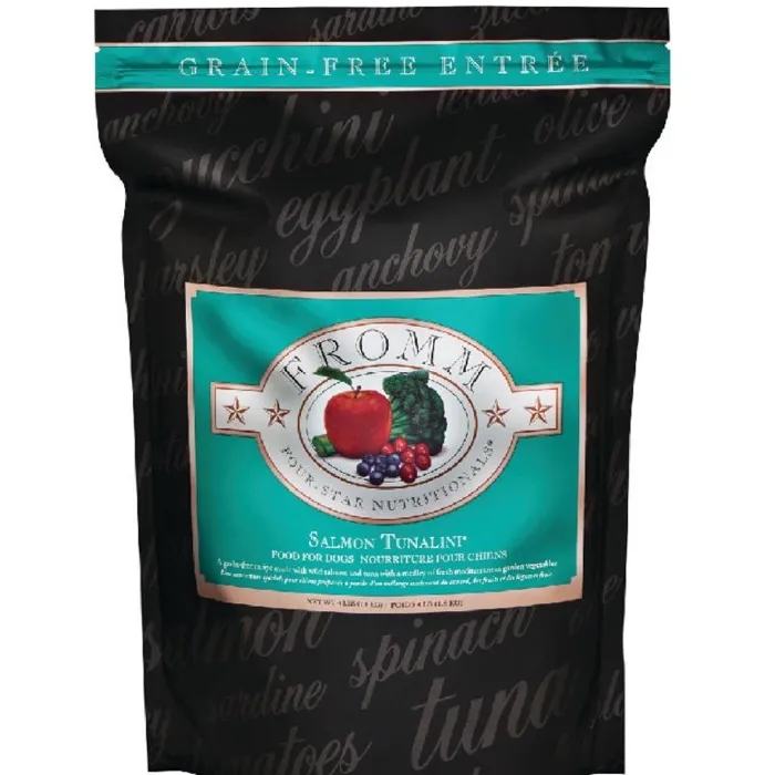 Keeping the needs of your dog in mind, Fromm Four Star Grain Free Salmon Tunalini Dry Dog Food is made to support the all breeds in all stages of life. Made with high amounts of protein and paired with fresh produce including potatoes and peas to provide high quality, easily digestible carbohydrates. Fromm Four Star Grain Free Salmon Tunalini Dry Dog Food provides well rounded, balanced nutrition for your furry friend without the unnecessary fillers! This recipe also supports the health of your dog‰ۡó»s coat and skin with guaranteed levels of Omega fatty acids and is enhanced with probiotics to ensure that their digestion is right on track! Fromm Four Star Grain Free Salmon Tunalini Dry Dog Food is grain free and made with quality ingredients found in the United States with no artificial colors, flavors, or preservatives that any pup is sure to love!