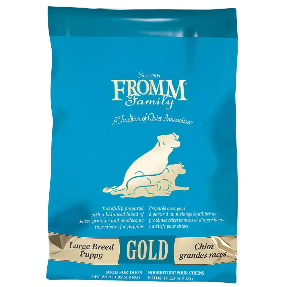 Fromm Family Large Breed Puppy Gold Food for Dogs is specifically developed for puppies of breeds with adult weights greater than 50 pounds. Large Breed Puppy Gold has lower protein and fat than traditional puppy food to provide the large breed puppy with an optimum level of energy and nutrition required for controlled and proper growth.