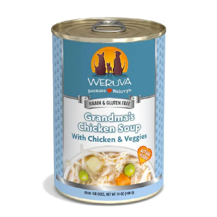 Feed your dog a classic recipe with Weruva Grandma's Chicken Soup Canned Dog Food. A classic staple in American cuisine. Your furry companion will feel right at home with this age-old recipe including boneless, skinless, white breast chicken and non-GMO veggies such as peas, carrots, and pumpkin. Pumpkin is proven to help with digestion issues as well so Weruva Grandma's Chicken Soup Canned Dog Food is perfect for any pups with tummy issues. Weruva Grandma's Chicken Soup Canned Dog Food is free of grains for a balanced meal in each can.