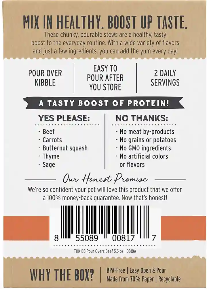 Jazz up your canine's dry dog food with The Honest Kitchen Pour Overs Stew Wet Dog Food Topper. Made with just seven ingredients including beef bone broth, beef, carrots and butternut squash this recipe serves as a delicious and nutritious stew that's pourable too! Every Pour Overs topper is specially designed for intermittent or supplemental feeding only. With a wide variety of flavors to choose from, each slow-cooked stew is grain-free and made with 100% natural ingredients you can trust and all the tail-wagging taste your dog will love!