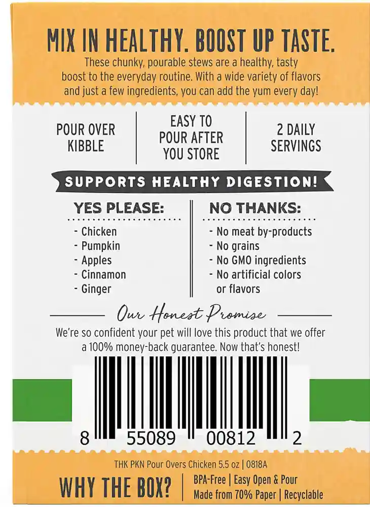 Jazz up your canine's dry dog food with The Honest Kitchen Pour Overs Stew Wet Dog Food Topper. Made with just nine ingredients including chicken bone broth, chicken, pumpkin, apples and butternut squash, this recipe serves as a delicious and nutritious stew that's pourable too! Every Pour Overs topper is specially designed for intermittent or supplemental feeding only. With a wide variety of flavors to choose from, each slow-cooked stew is grain-free and made with 100% natural ingredients you can trust and all the tail-wagging taste your dog will love!