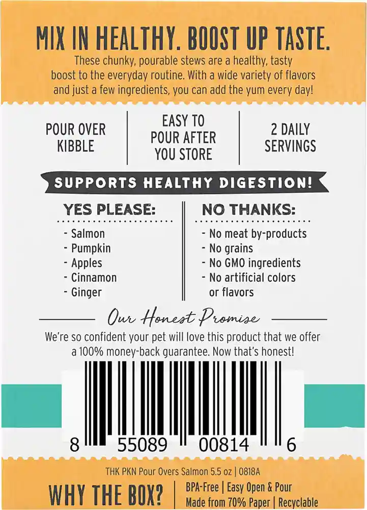 Jazz up your canine's dry dog food with The Honest Kitchen Pour Overs Stew Wet Dog Food Topper. Made with just nine ingredients including turkey bone broth, real salmon, pumpkin, apples and butternut squash, this recipe serves as a delicious and nutritious stew that's pourable too! Every Pour Overs topper is specially designed for intermittent or supplemental feeding only. With a wide variety of flavors to choose from, each slow-cooked stew is grain-free and made with 100% natural ingredients you can trust and all the tail-wagging taste your dog will love!