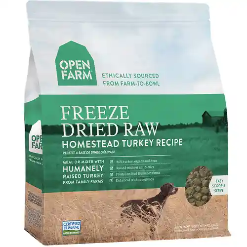 Easy to serve and hard to resist. This high protein topper or complete meal is packed with humanely raised antibiotic-free raw turkey. For added nutritionåÊOpen Farm includes functional ingredients like locally sourced leafy greens, squash and pumpkin seeds, superfoods like coconut oil, and antioxidants like blueberries.