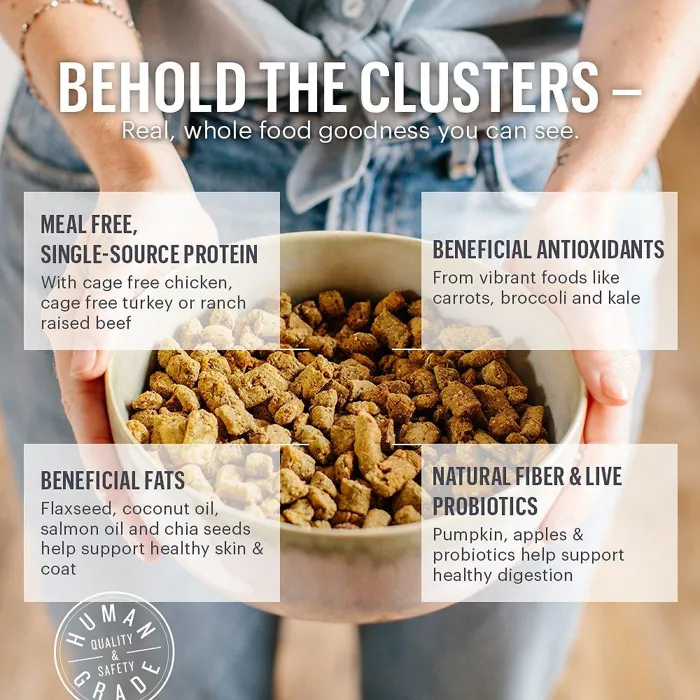 - Bite-sized clusters combine whole foods you can see and maximum nutrition your pup can feel. And each small batch is made in a human food kitchen and less processed than most traditional kibble!