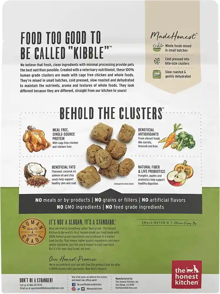Dogs are family too, which is why they deserve the highest quality nutrition. The Honest Kitchen Grain-Free Chicken Clusters Dry Dog Food is too good to call kibble because it truly stands out from the rest with fresh, clean ingredients and minimal processing. The whole food clusters purposely don’t look like your traditional dry dog food and that’s because they’re made in small batches, cold-pressed and then slow-roasted and dehydrated. This process locks in the aroma, nutrients and textures of whole foods like chicken, peas, lentils, eggs, carrots and more. So, give your canine companion delicious and nutritious clusters without compromise!