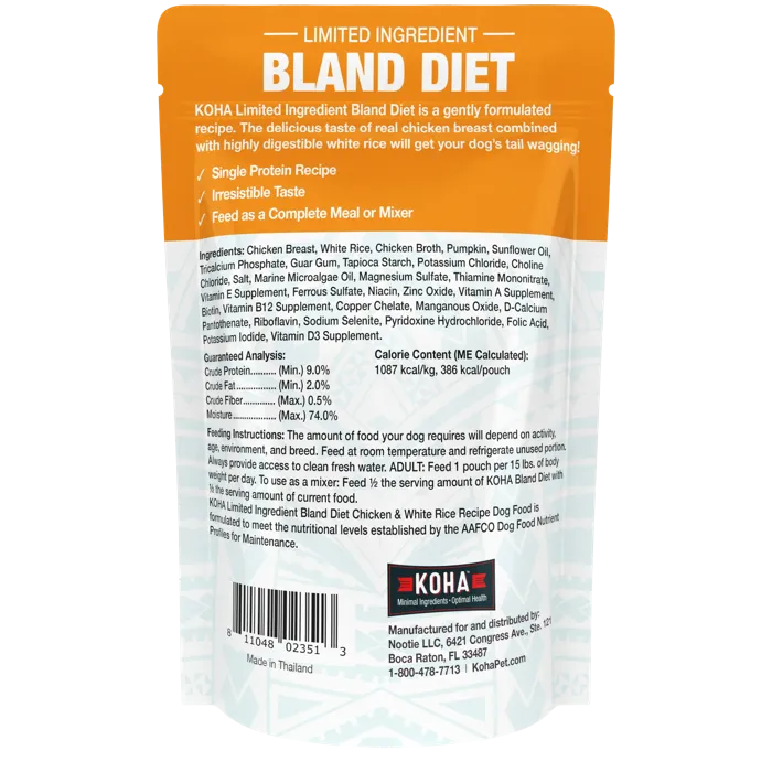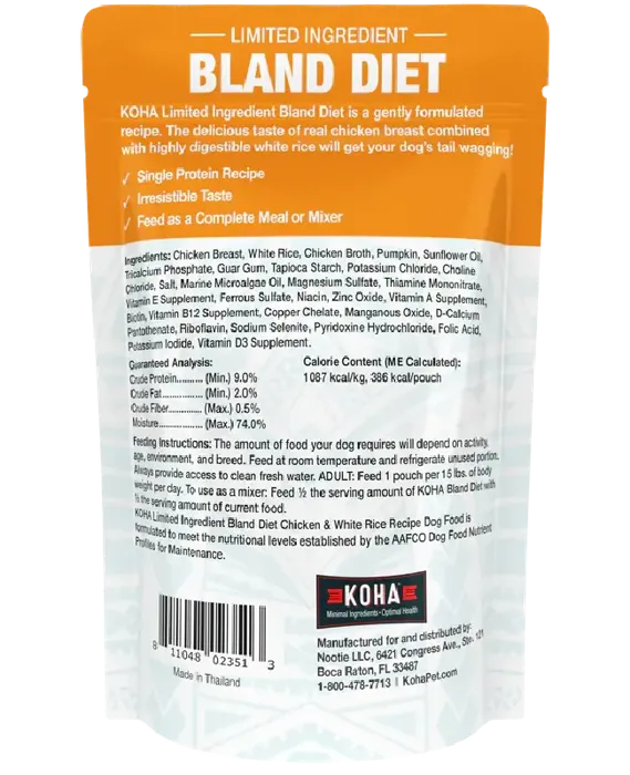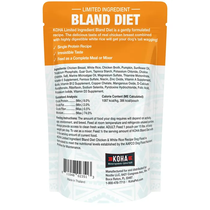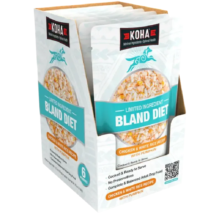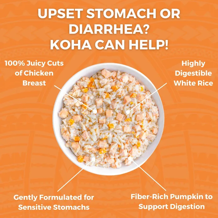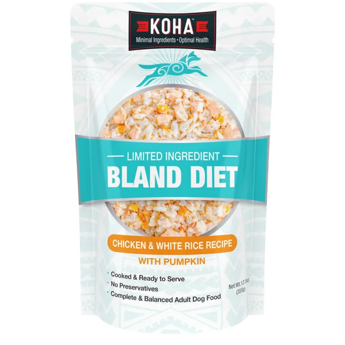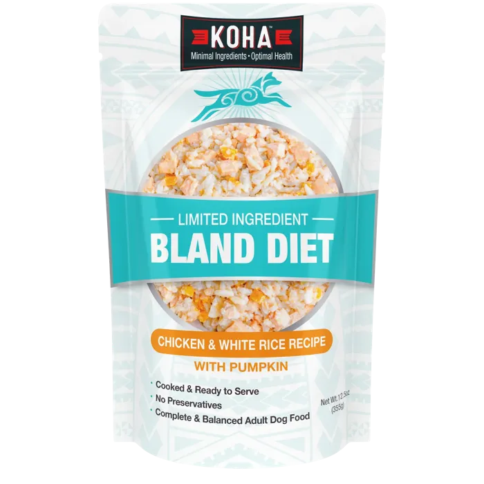 KOHA Bland Diet for dogs is ideal for dogs with upset stomach, loose stool, or diarrhea. This gently formulated limited ingredient dog food recipe has just one protein source for easy digestion. It also includes white rice and pumpkin to support healthy stools and regularity.