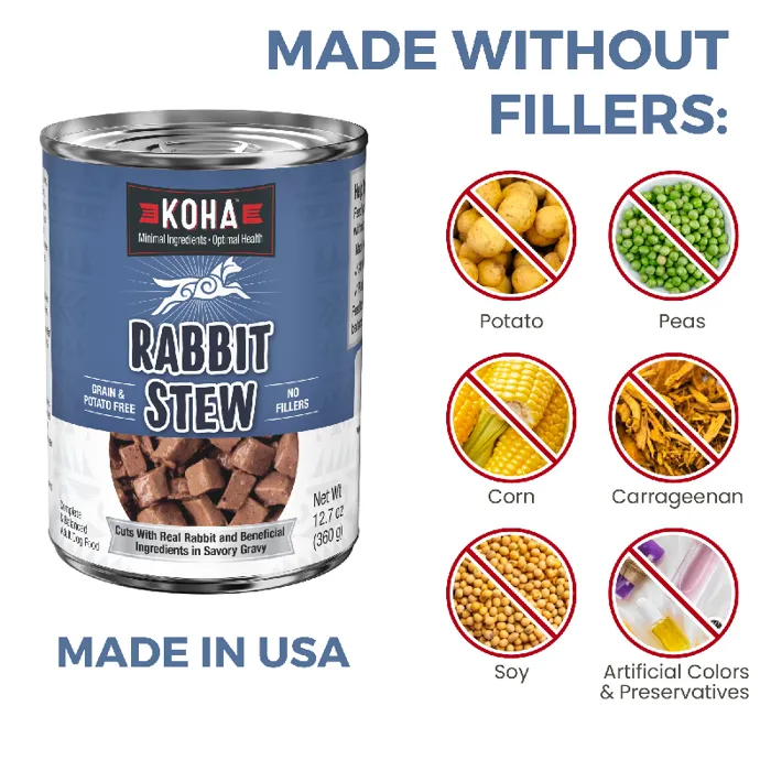 Ideal for food sensitivities, digestive issues, and picky eaters KOHA Minimal Ingredient Rabbit Stew for Dogs is a moisture-rich recipe packed with cuts of meat in a savory gravy. With meat as the first ingredient and no carb-loaded fillers like grains, peas, potatoes, or corn that can lead to digestive issues, KOHA minimal ingredient stews are ideal for dogs with food sensitivities.