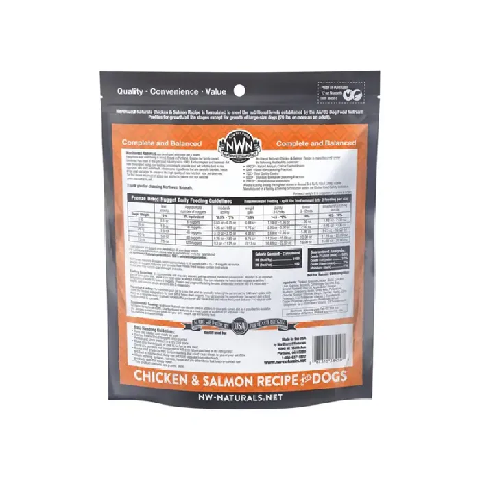 Northwest Naturals Chicken & Salmon Recipe Freeze-Dried Dog Food Nuggets 12oz was developed with your pet's health, happiness and well-being in mind. This complete and balanced diet follows raw feeding principles and is the same as Northwest Naturals Raw Frozen Diet, in convenient freeze-dried form. Northwest Naturals raw food provides essential, species appropriate benefits to your pet that cooked food simply cannot compete with!