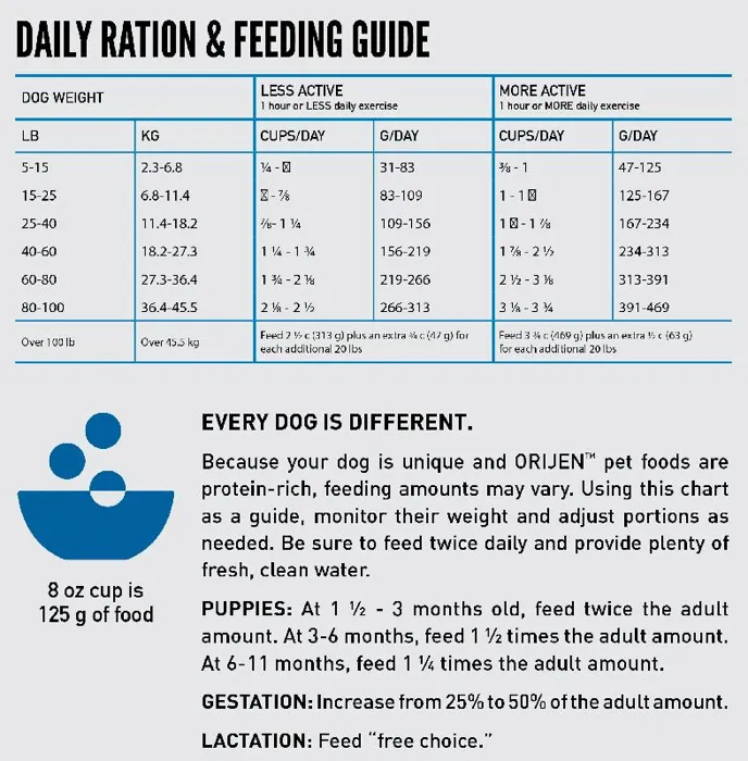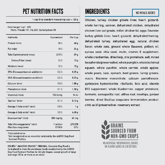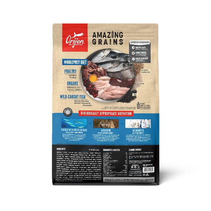 ORIJEN Amazing Grains is packed with fresh or raw animal protein and enhanced with hand-selected grains to give your dog peak nourishment. With 90%* premium animal ingredients, ORIJEN Original with Amazing Grains includes WholePrey ingredients from free-run chicken and turkey, and wild-caught fish. These nutrient-dense animal ingredients provide your dog with the protein, vitamins and minerals they need to thrive. This diet includes only the most amazing grains in a high-quality blend of oats, quinoa and chia and more, hand-selected to provide a balanced fiber ratio that helps support your dog’s digestive health.